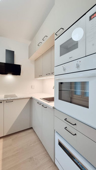sis. integroidut kodinkoneet (astianpesukone, mikroaaltouuni, liesi, uuni, liesituuletin), hiljentimet saranoissa ja vetolaatikoissa. Kokonaisuuden viimeistelee kauko-ohjattava keittiön himmennettävä LED-valaistus.
