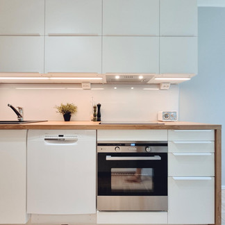 Keittiö sis. integroidut kodinkoneet (astianpesukone, mikroaaltouuni, liesi, kiertoilmauuni, liesituuletin), hiljentimet saranoissa ja vetolaatikoissa, tyylikäs no-frost jääkaappipakastin. Kokonaisuuden viimeistelee keittiön kauko-ohjattava LED-valaistus. ja reilun kokoiseen tilaan mahtuu helposti neljän hengen ruokaryhmä.