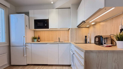 ✅ Keittiö on toteutettu toimivaksi vaativammallekin kokkaajalle ja reilun kokoiseen tilaan mahtuu neljän hengen ruokaryhmä. /keittiö sis. integroidut kodinkoneet (astianpesukone, liesi, uuni, liesituuletin, no-frost jääkaappipakastin)